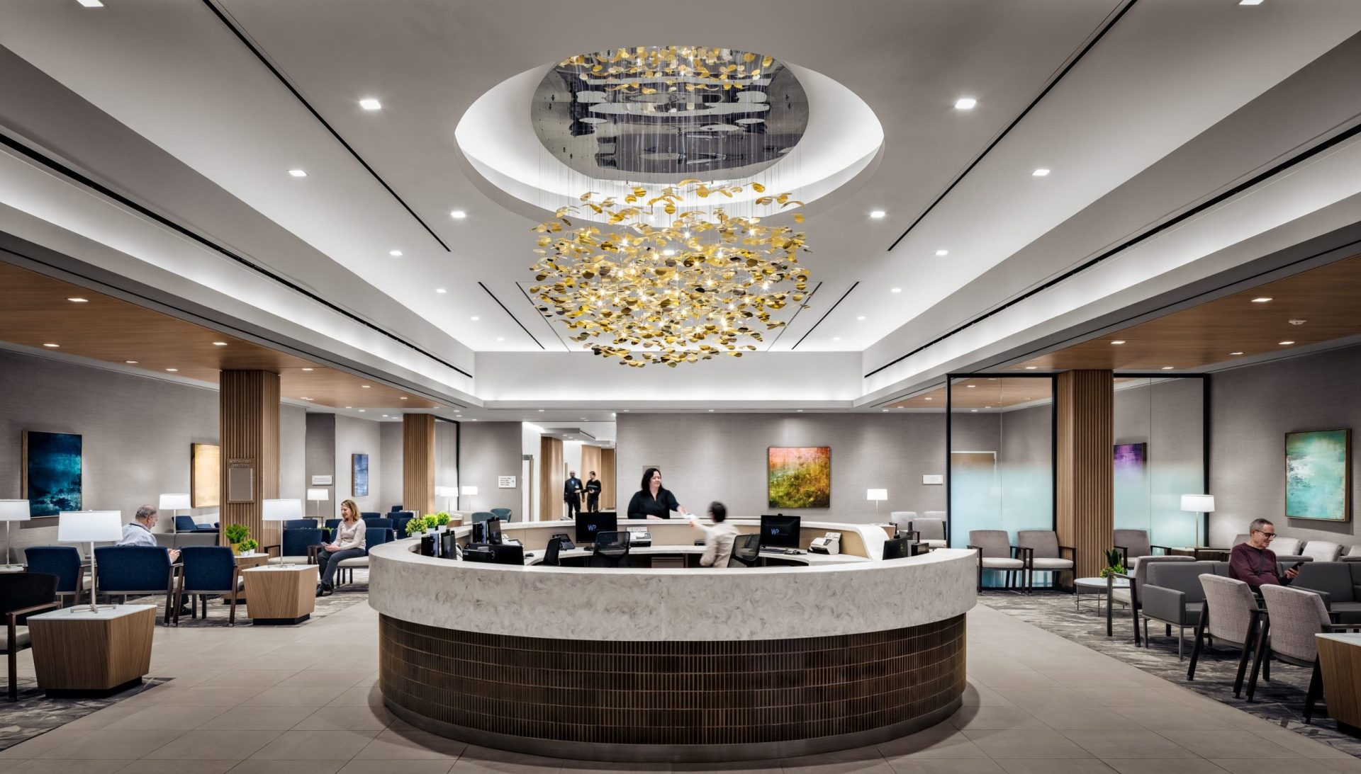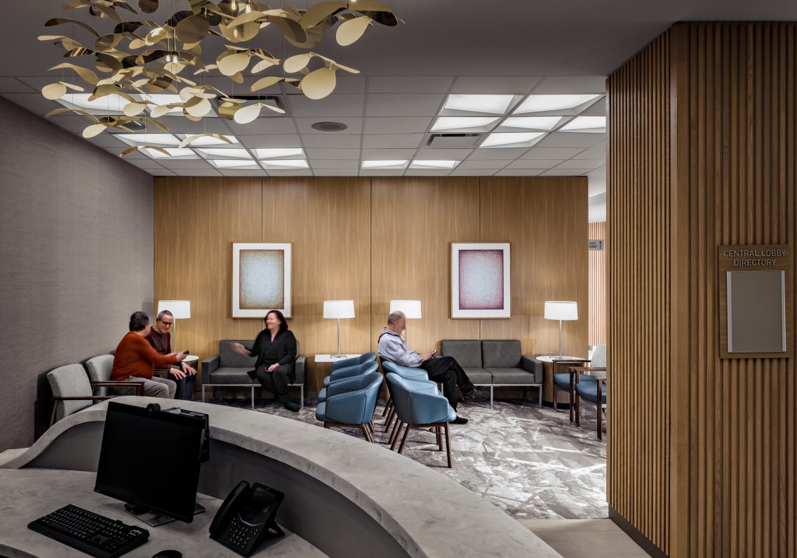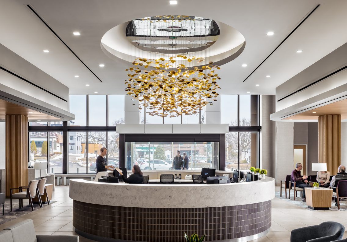 The elegant and welcoming interior character is achieved through the use of a natural palette of materials including tile and wood ceilings and accents. Entrance points are punctuated with a custom designed, hanging light fixture at each reception desk. These sculptural elements are focal points that lend a sense of beauty and continuity throughout the facility.