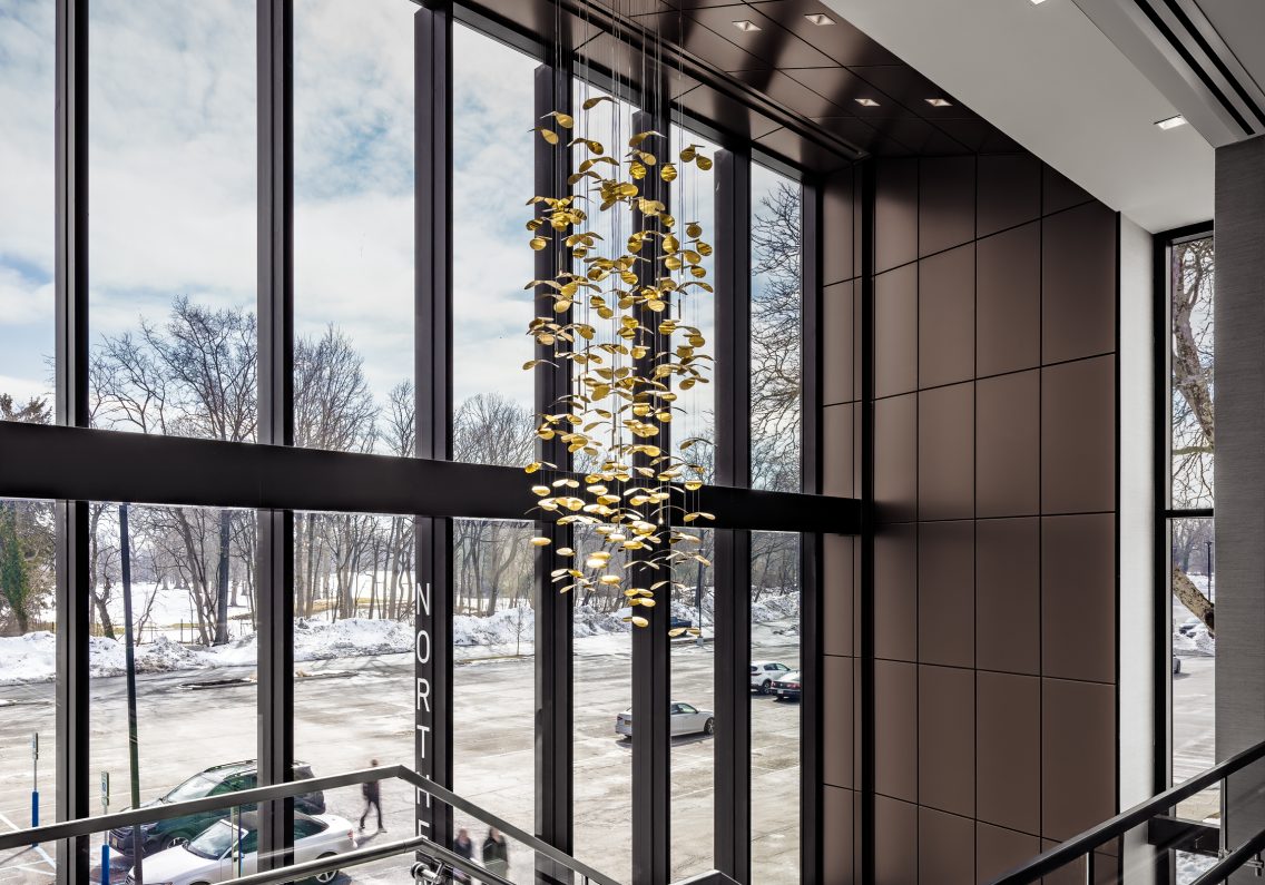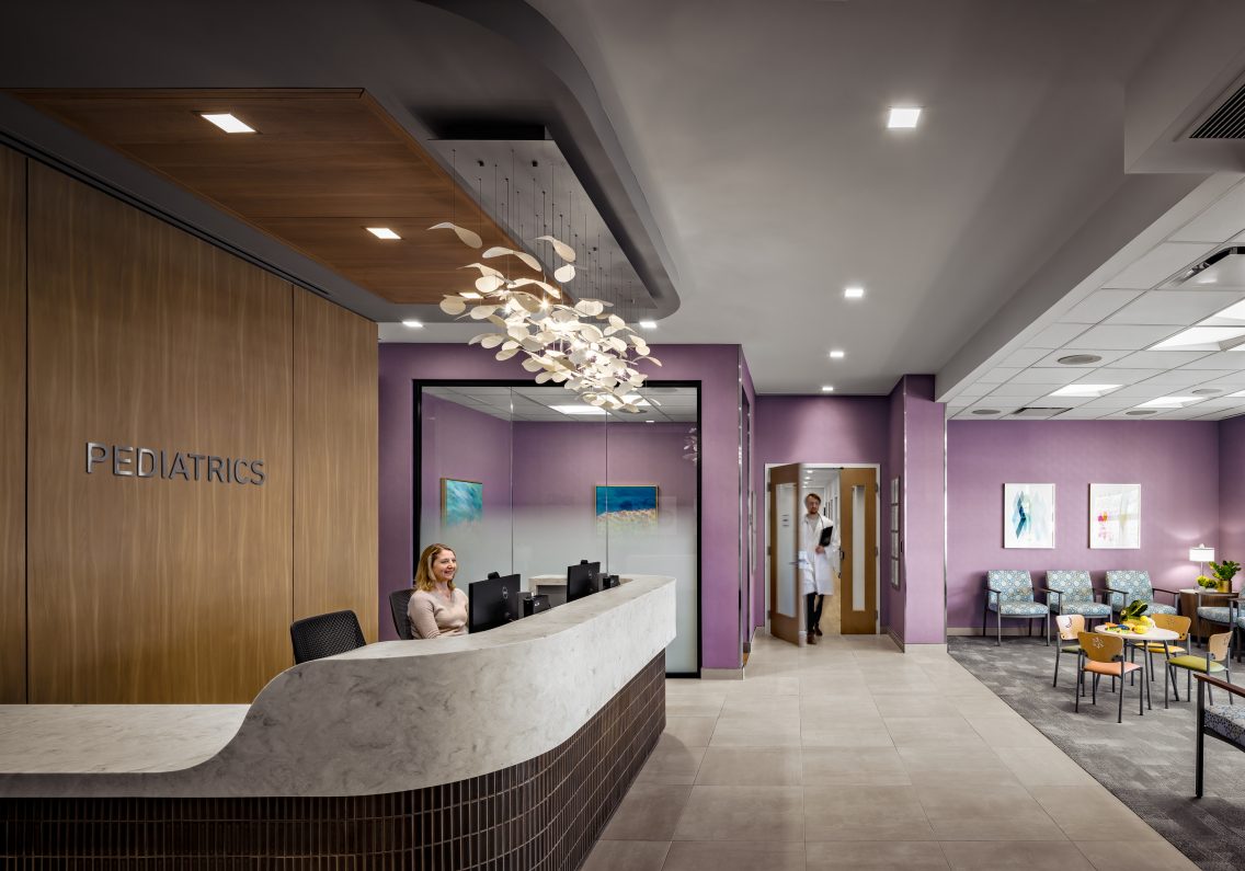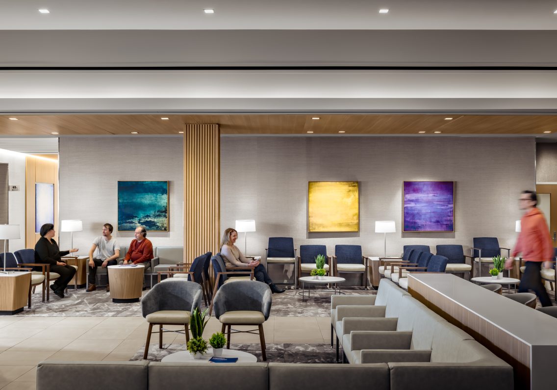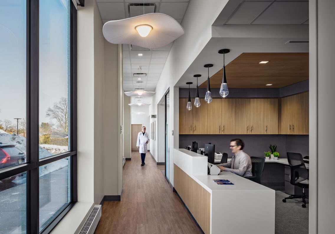 The elegant and welcoming interior character is achieved through the use of a natural palette of materials including tile and wood ceilings and accents. Entrance points are punctuated with a custom designed, hanging light fixture at each reception desk. These sculptural elements are focal points that lend a sense of beauty and continuity throughout the facility.
